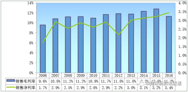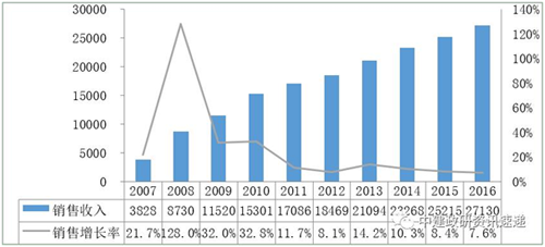 近10年来,销售平均年增长率为24%,说明该行业在这10年得到快速发展。近3年的销售平均增长率为8.7%。2016年的销售增长率为7.6%,说明2016年的销售增速明显低于前几年,这与国家经济形势密切相关。同期,7家企业共实现销售收入27130亿元,占全国GDP的3.65%,这可是一个不可小觑的群体,对中国经济发展有一定的代表性。